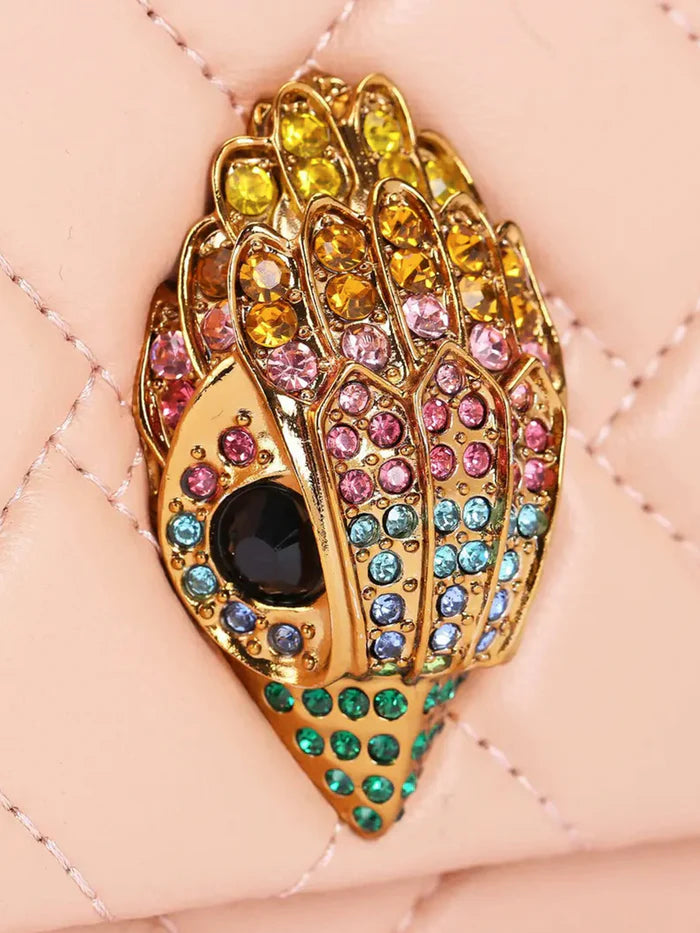 The Mini Kensington Long Flap is a cross body bag crafted from a soft blush leather with overstitch quilting combining both weave and chevron patterns. The oversized gold eagle head features rainbow crystals on the front flap.
