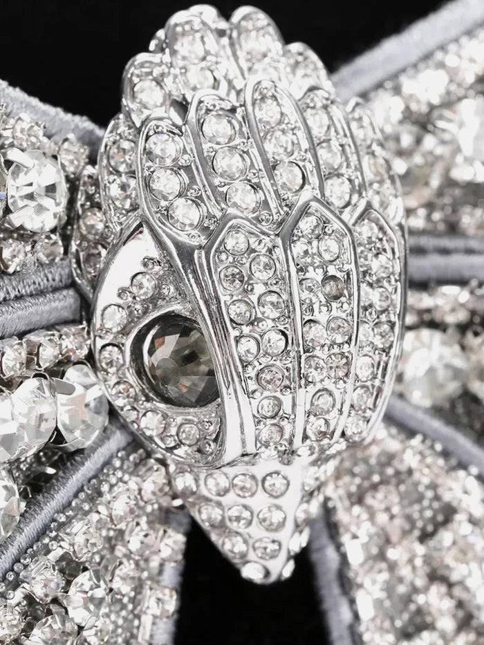 This Shoreditch Chain Wallet is crafted from a black velvet. The front flap is topped with a crystal embellished bow with silver eagle head at the centre.